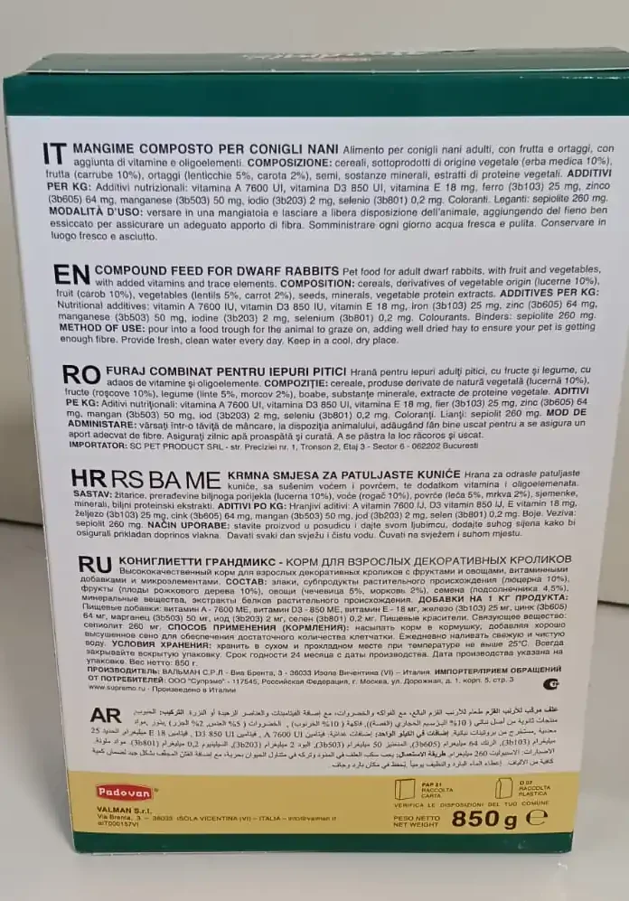 E’ un alimento composto dai semi piu’ apprezzati dai coniglietti, sapientemente dosati, arricchiti con verdura e frutta, per dare una alimentazione equilibrata e varia: con piu’ vitamine, per una migliore salute dell’animale. Il procedimento di precottura a cui sono sottoposti alcuni componenti del mangime, rende il prodotto piu’ digeribile con conseguente riduzione dei cattivi odori.