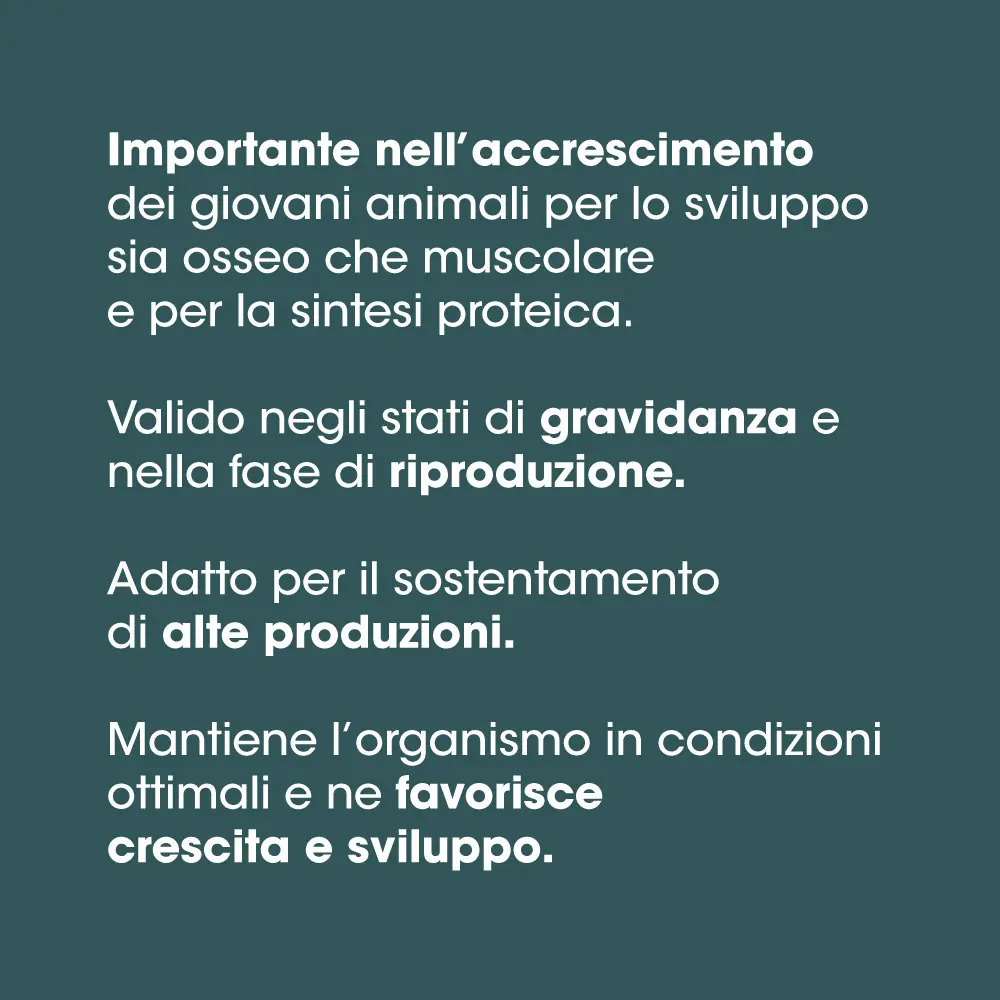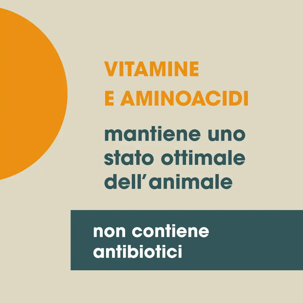 ADDITIVI PER KG: Additivi nutrizionali – Vitamine, provitamine e sostanze ad effetto analogo chimicamente ben definite: 3a672a Vitamina A (retinil acetato) 1.000.000 U.I., 3a671 Vitamina D3 (colecalciferolo) 200.000 U.I., 3a700 Vitamina E (tutto-rac-alfa tocoferile acetato) 4.000 mg, 3a311 Vitamina C 25.000 mg, 3a820 Vitamina B1 1.400 mg, 3a825i Vitamina B2 2.000 mg, 3a831 Vitamina B6 1.400 mg, 3a835 Vitamina B12 2 mg, 3a315 Niacinamide 10.000 mg, 3a841 Calcio D-pantotenato 6.000 mg, 3a316 Acido folico 160 mg. Composti di oligoelementi: 3b108 Chelato di ferro (II) di idrato di glicina (Fe: 1005 mg), 3b605 Zinco solfato monoidrato (Zinco: 364 mg), 3b405 Rame (II) solfato pentaidrato (Rame: 25,5 mg), 3b201 Ioduro di potassio (Iodio: 152,8 mg), 3b503 Manganese solfato monoidrato (Manganese: 325 mg).