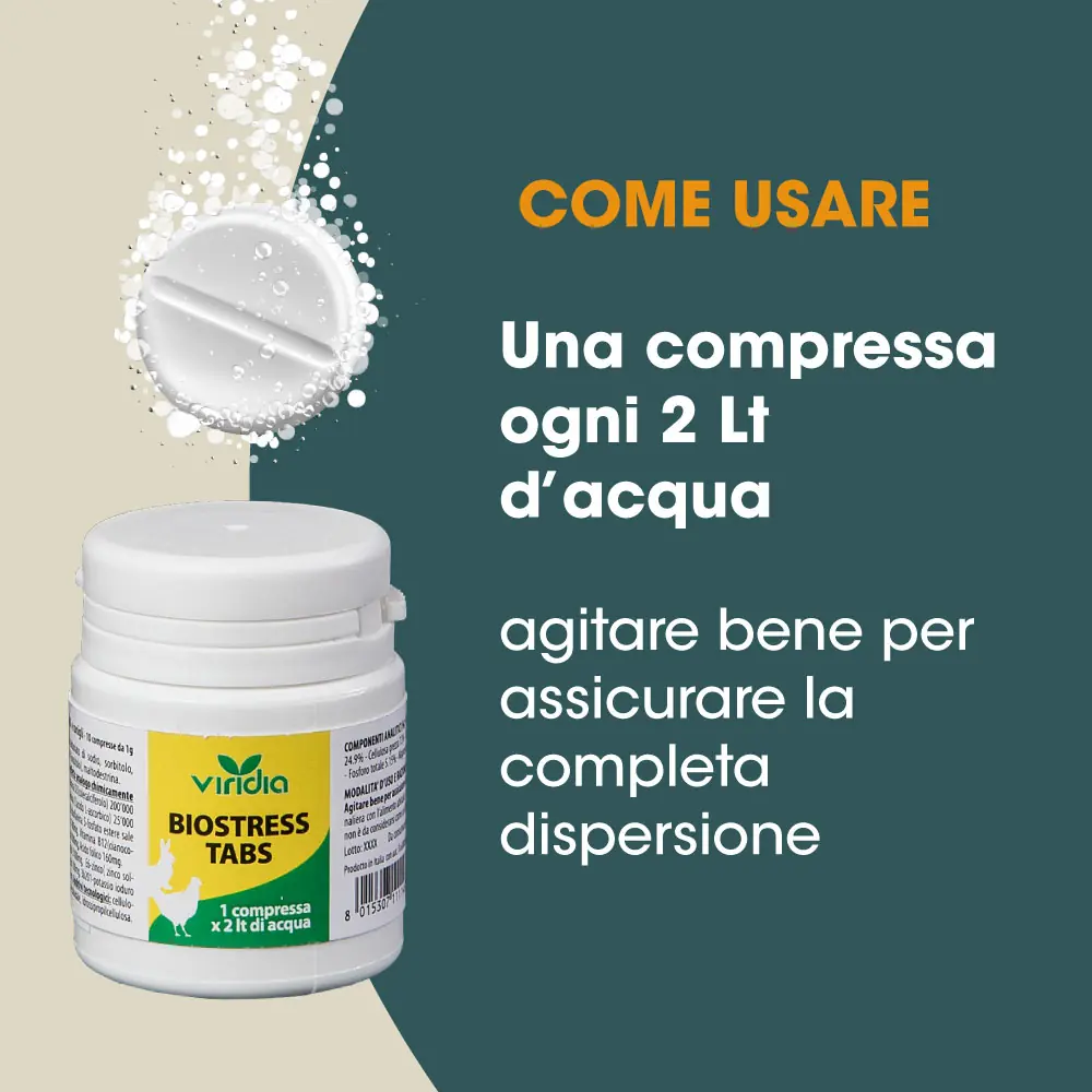 Dosi e modalità di impiego: 1 compressa ogni 1-2 litri di acqua. Agitare bene per assicurare la completa solubilizzazione. Completare la razione giornaliera con l’alimento abituale. La presenza di deposito sul fondo dopo la solubilizzazione non è da considerarsi come un difetto.