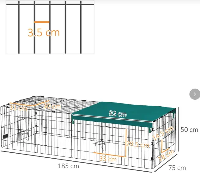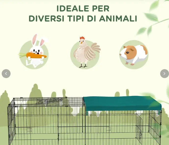 Gabbia per animali può essere usata sia in casa sia negli spazi all’aperto. Si monta facilmente grazie alle clip in plastica per assemblare i pannelli, è dotato di 2 porte principali, 2 ingressi laterali e uno superiore. Comprende un telo in tessuto protettivo per avere una zona di copertura e picchetti per fissare il recinto nel terreno.