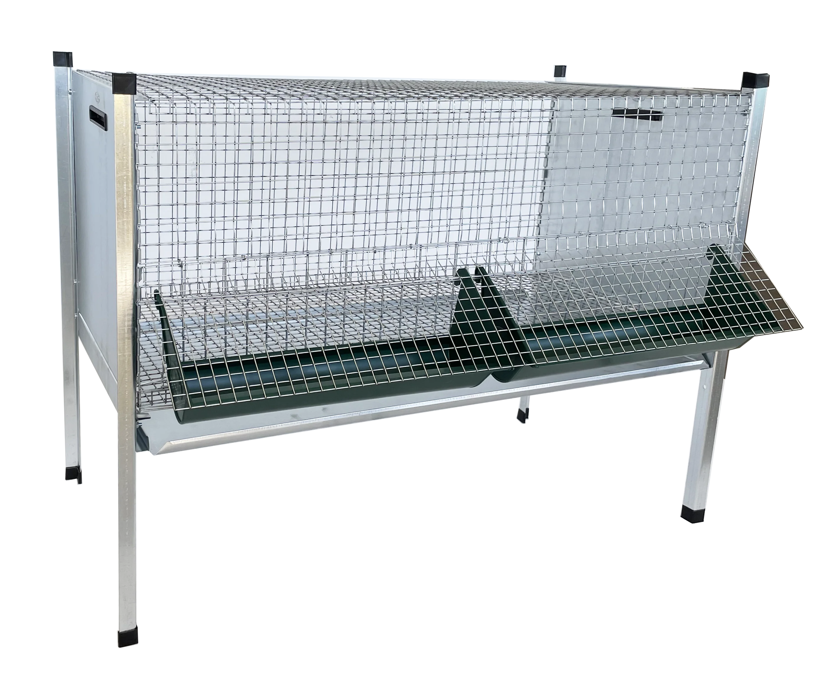 Gabbia per pulcini/polli in rete e testate in acciaio, coperchio con molla per il blocco di apertura sportello superiore, comprende padella, mangiatoia e abbeveratoio.