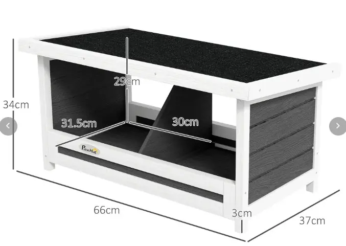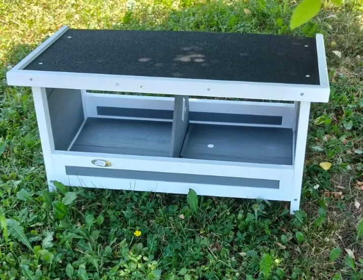 Nido per galline da esterno, in legno di abete e tetto spiovente in bitume con base elevata per evitare umidità del suolo. Può ospitare fino a 2 galline simultaneamente con zone divise e ampie.