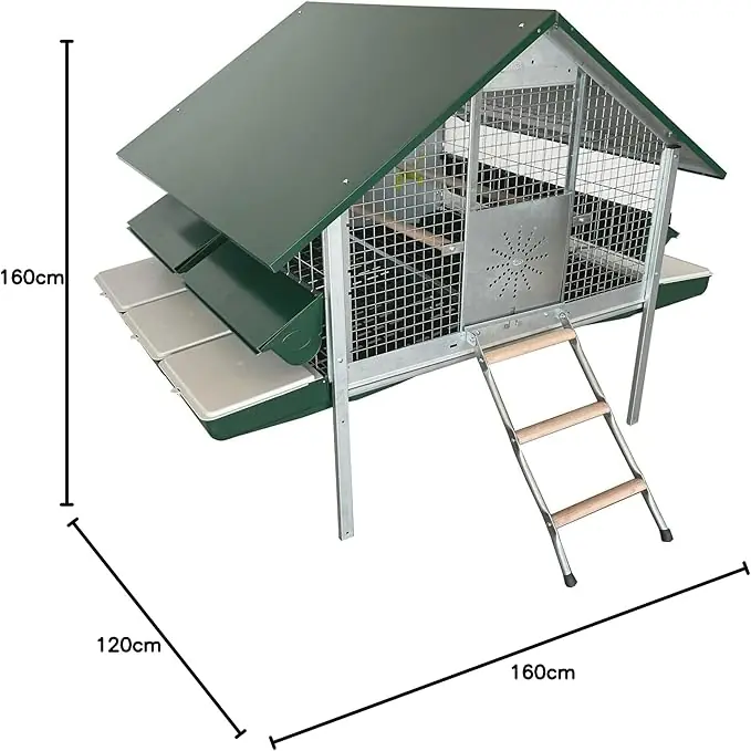 Possibilità di montare il kit padelle per deiezioni, venduto a parte come accessorio. La porta di accesso a ghigliottina misura cm 27 x H 29 e la scala è in tubolare zincato con pioli in legno.