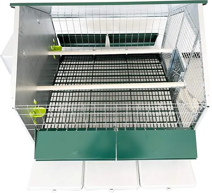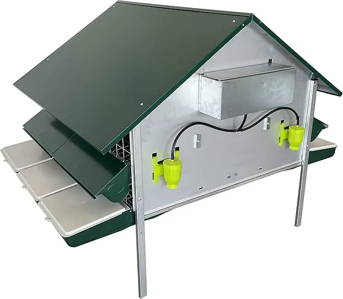 Pollaio anti predatore a casetta con tetto in lamiera zincata e verniciata di verde, per galline. Il pannello frontale è in maglia ed il fondo in grigliato plastico consente il rotolamento delle uova verso i nidi laterali e la caduta al suolo delle deiezioni. Dotata di 4 mangiatoie in plastica da 46cm con rastrelliera anti-spreco e coperchio in lamiera, 2 abbeveratoi a livello costante con serbatoio da 8 litri e relativi tubi e raccordi di collegamento