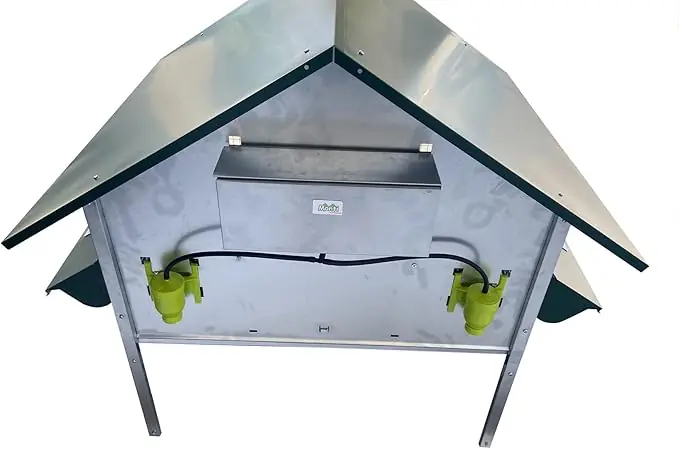 La scala è in realizzata in tubolare zincato con pioli in legno. Predisposizione per il montaggio di kit padelle deiezioni. Dispone di 4 mangiatoie lineari in plastica da cm 46 con rastrelliera anti-spreco e coperchio in lamiera, 2 abbeveratoi a livello costante alimentati da un serbatoio in lamiera e 2 posatoi in faggio da 1 mt con scanalature per un comodo e sicuro stazionamento delle galline.