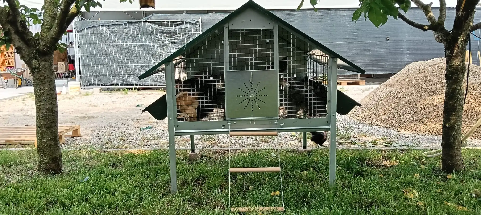 Pollaio per polli all’ingrasso anti predatori, molto pratico per la pulizia e la gestione degli animali. Le maglie della rete del pannello frontale sono di mm 22 x 22, le maglie del fondo sono di mm 19 x 19.