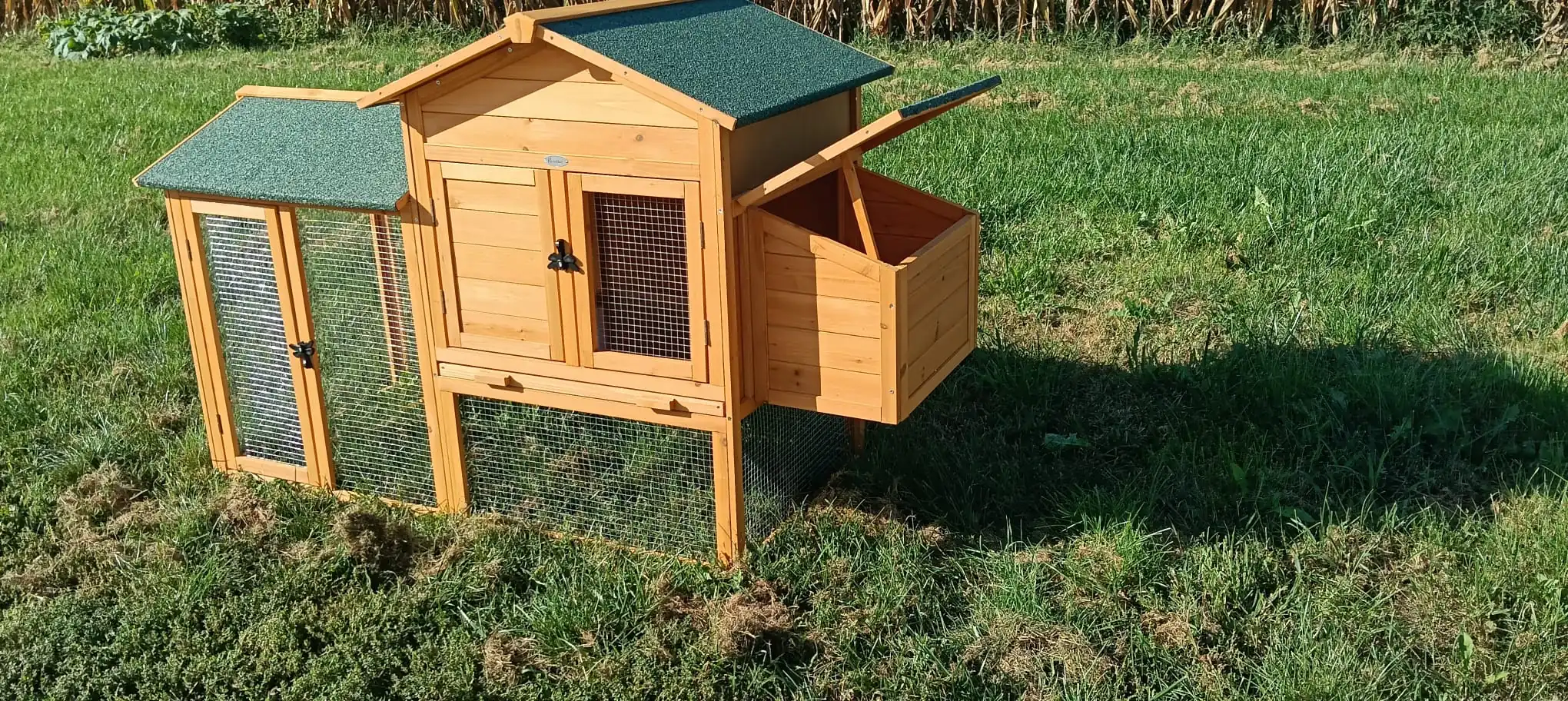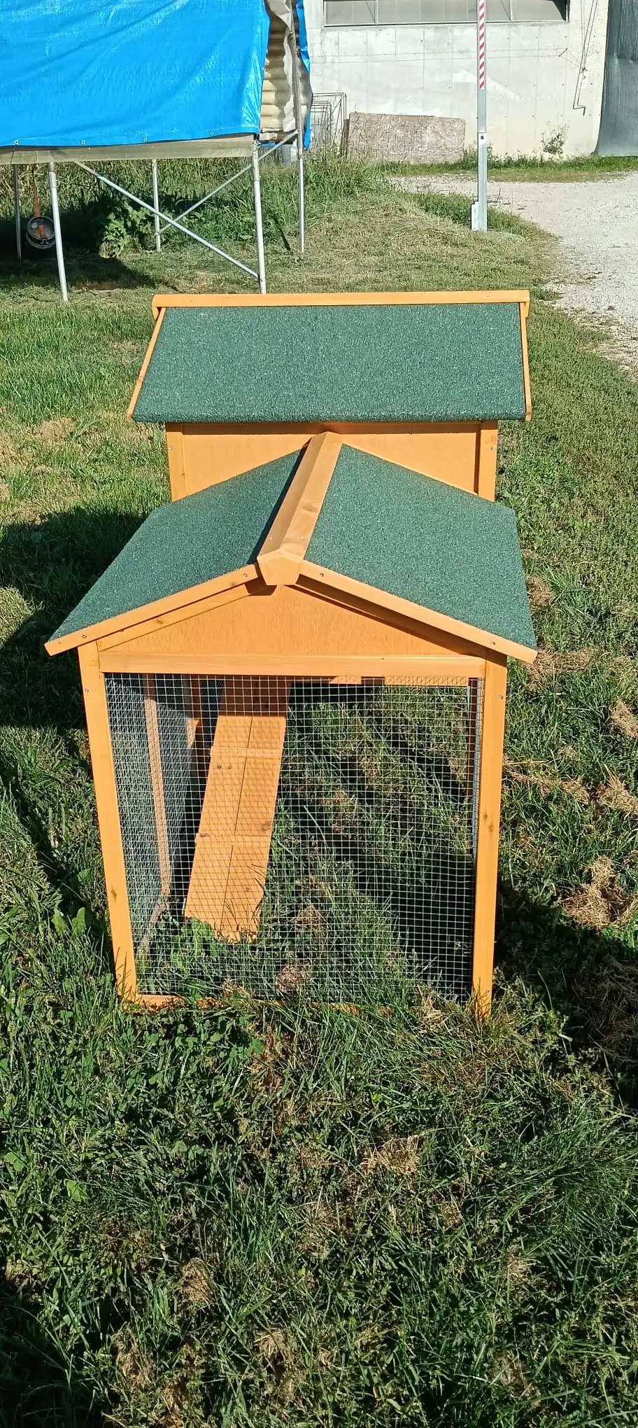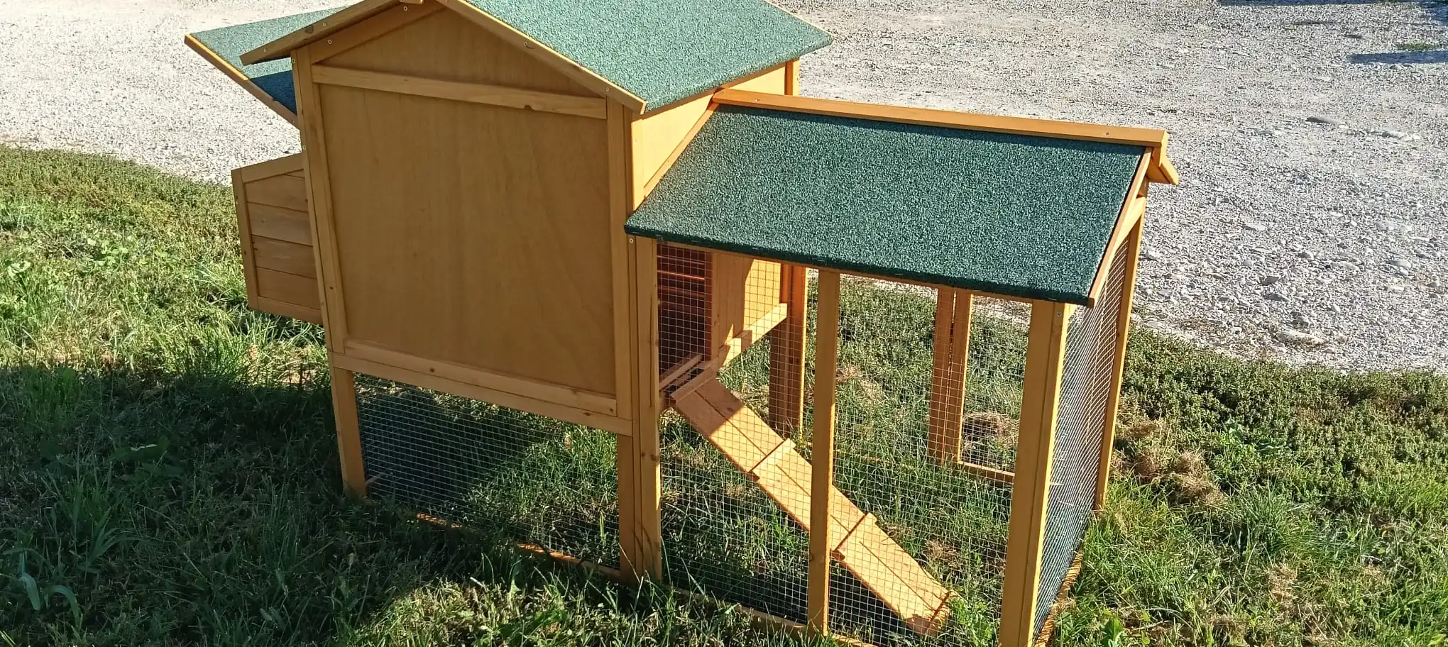 Pollaio in legno di Abete rifinito con vernice ad acqua, tetto in asfalto che ripara dalle intemperie e filo di metallo per la recinzione della zona aperta.