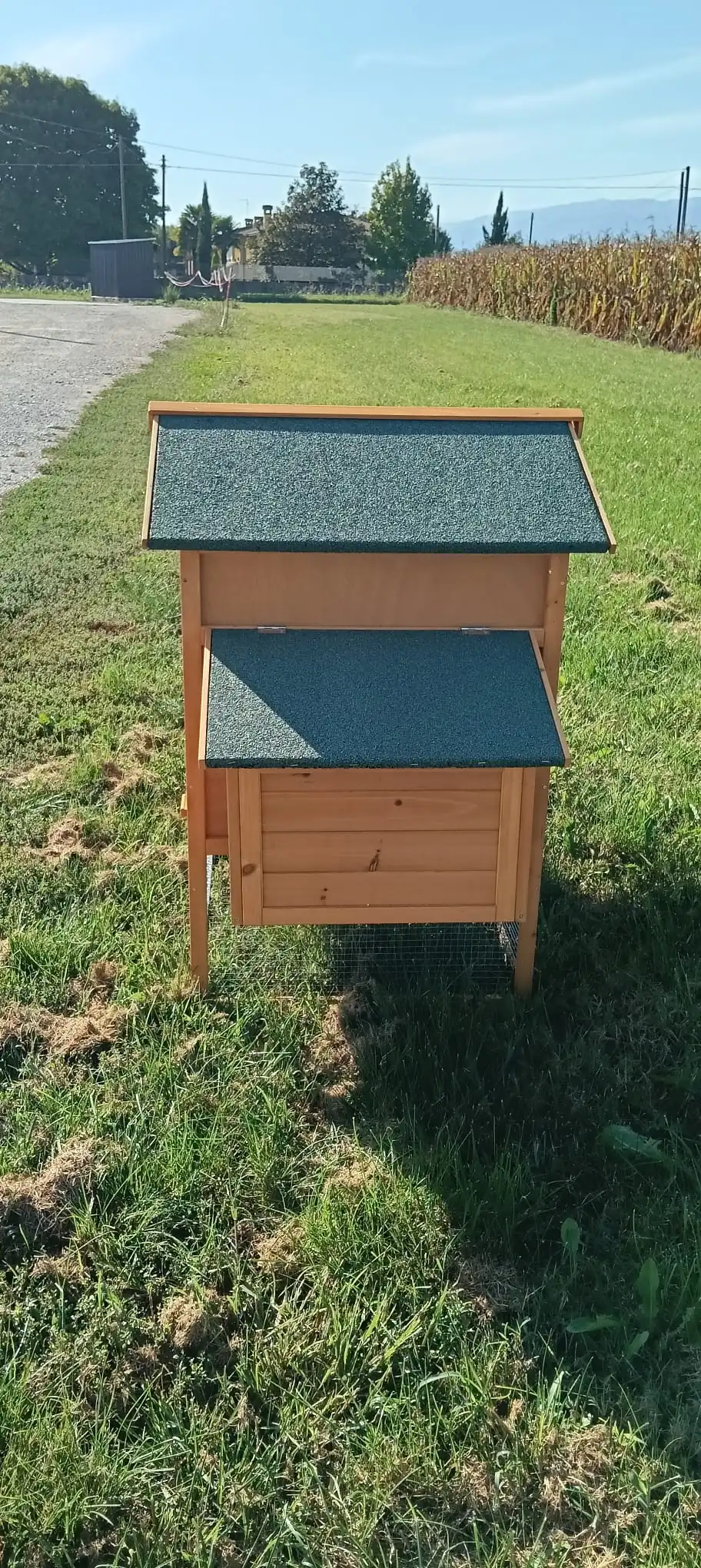 Il pollaio per galline comprende un nido per la cova apribile per recuperare facilmente le uova, predispone di rampa per facilitare entrata e uscita delle galline, un vassoio sottostante nella zona ricovero per la pulizia con porta per ispezione. Oltre alla porta è presente una finestra con rete per ricircolo d’aria. In aggiunta, inserita nella zone recintata, una porta per far uscire libere le galline.