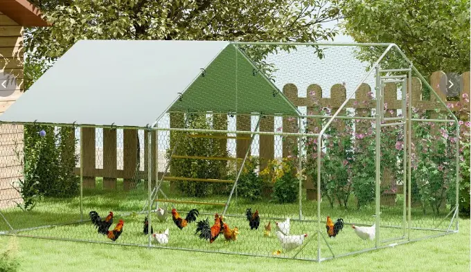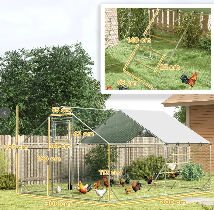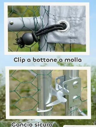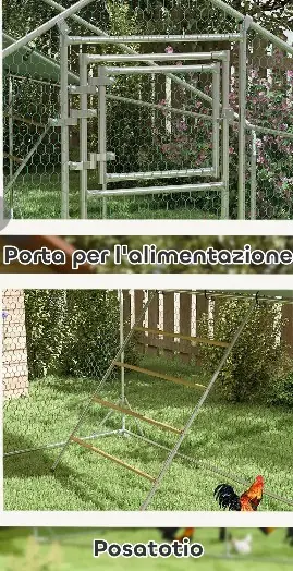 Il recinto per galline offre un’ampia area di 12 m², un tetto inclinato con zona coperta da tessuto impermeabile e resistente ai raggi UV. Dispone di telaio in acciaio galvanizzato e rete in acciaio plastificato a maglie esagonali piccole. Presente una porta che dispone di un’apertura piccola per inserire il cibo evitando la fuga degli animali.
